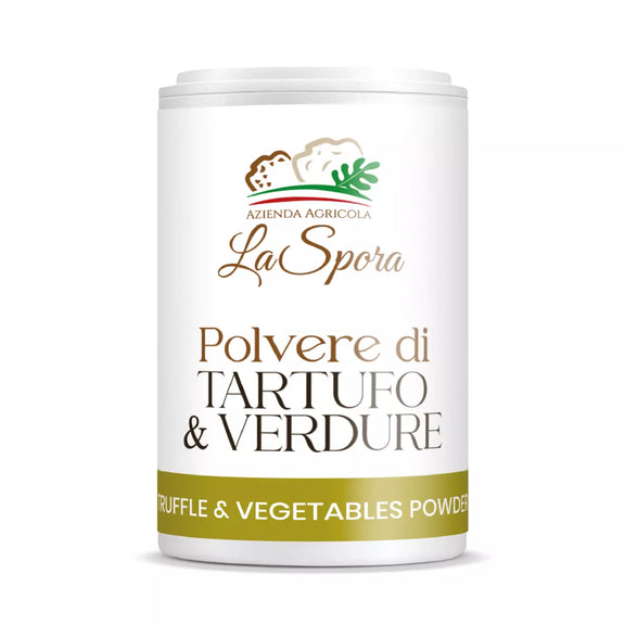 - Polvere di tartufo e verdure 30g: facile e veloce da utilizzare, per dare un pizzico di brio ad antipasti, primi piatti, contorni, secondi piatti e dessert. Ingredienti: carota disidratata 30%, sedano disidratato 30%, scalogno disidratato 30%, prezzemolo disidratato, tartufo estivo disidratato (Tuber Aestivum Vitt.) 2%, aromi naturali.